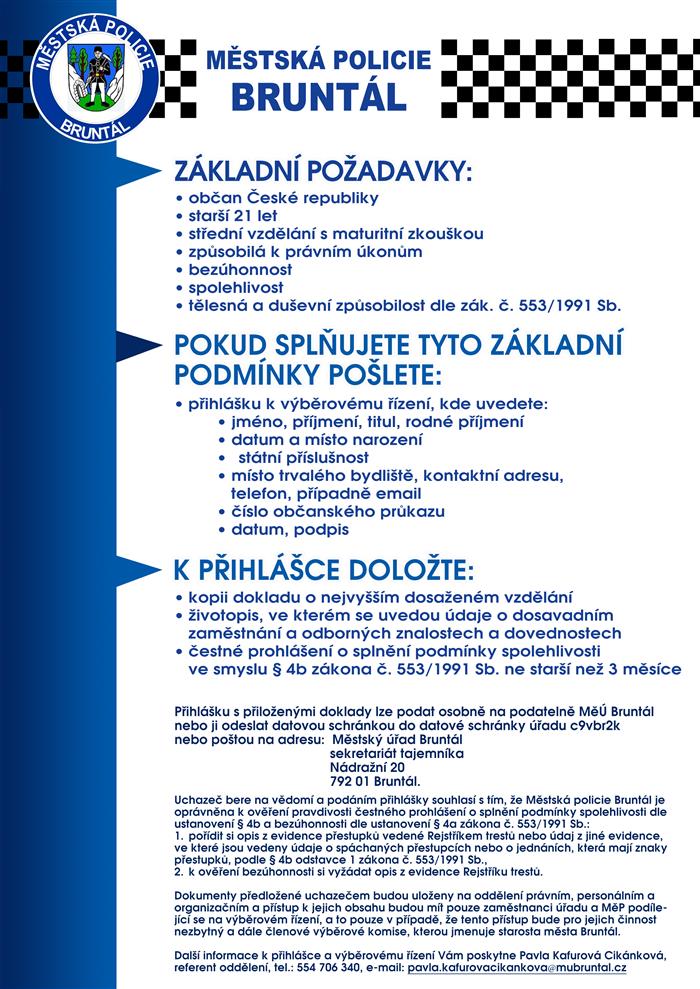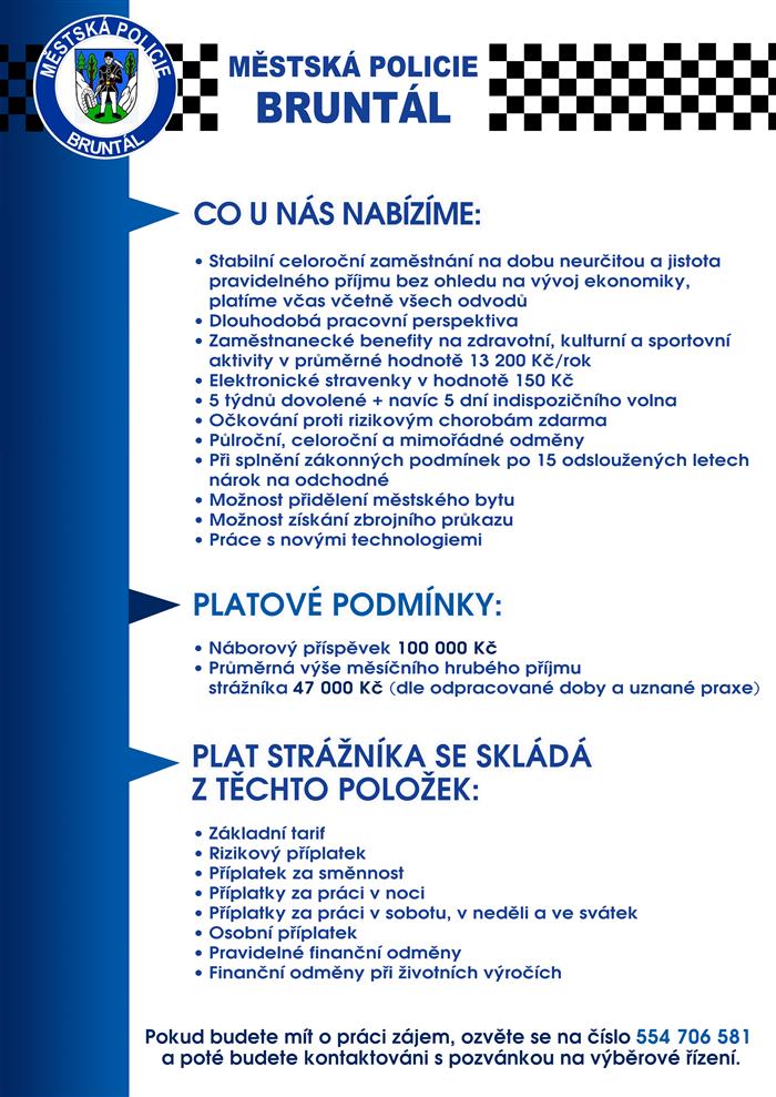 Městská policie Bruntál vyhlašuje nábor nových strážníků. Nabízí stabilní a pestrou práci s náborovým příspěvkem 100 000 Kč a průměrným hrubým příjmem 47 000 Kč. K tomu zaměstnanecké benefity jako jsou odměny, 5 týdnů dovolené aj.