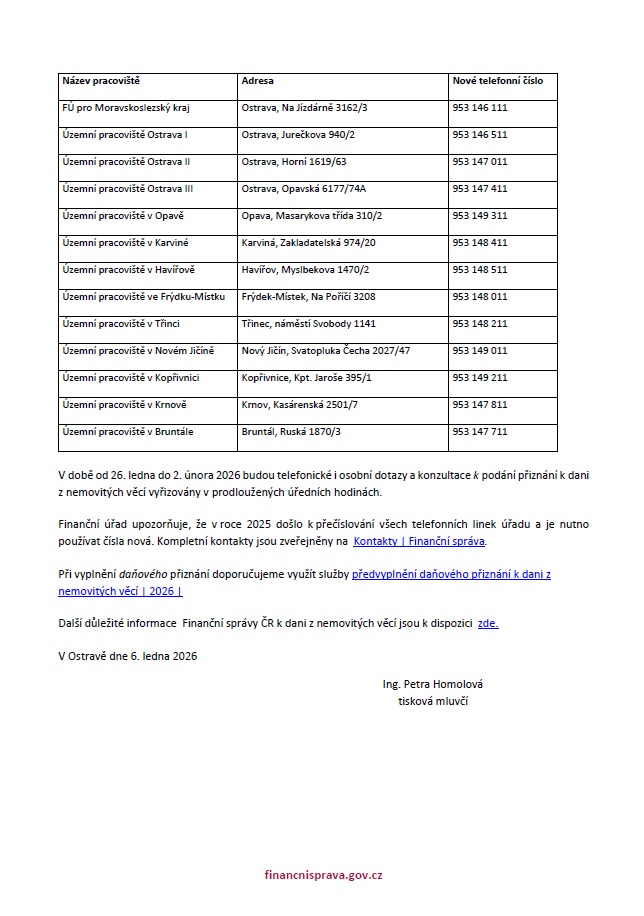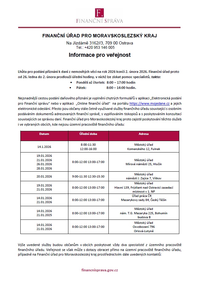 Finanční úřad proto od 26. ledna do 2. února prodlouží úřední hodiny: