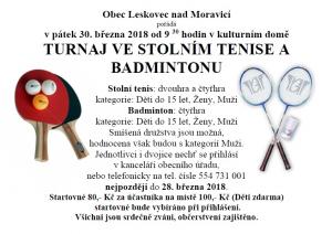Obec Leskovec nad Moravicí pořádá v pátek 18. dubna 2025 v kulturním domě turnaj ve stolním tenise a badmintonu. K dispozici budou kategorie pro děti, ženy a muže. Přihlášení do 16. dubna 2025, startovné 100 Kč za účastníka, na místě 120 Kč, děti zdarma.
