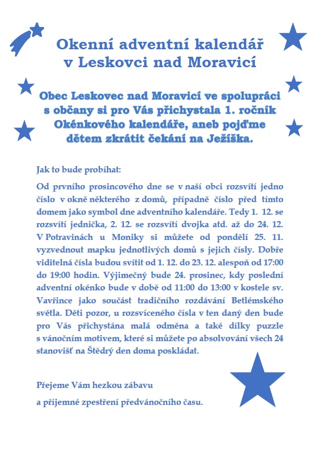 Obec Leskovec nad Moravicí ve spolupráci s občany si pro Vás přichystala 1. ročník Okénkového kalendáře, aneb pojďme dětem zkrátit čekání na Ježíška.
