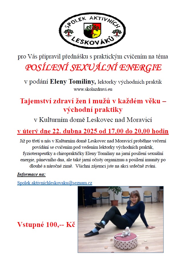 Dne 22. dubna se koná přednáška s praktickým cvičením na téma posílení sexuální energie pod vedením Eleny Tomiliny. Přijďte posílit své zdraví a imunitu.