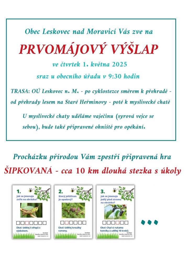 Obec Leskovec n. M. si pro Vás připravila procházku přírodou s názvem "PRVOMÁJOVÝ VÝŠLAP". Během cesty bude připravena hra - ŠIPKOVANÁ a na konci čeká odměna.