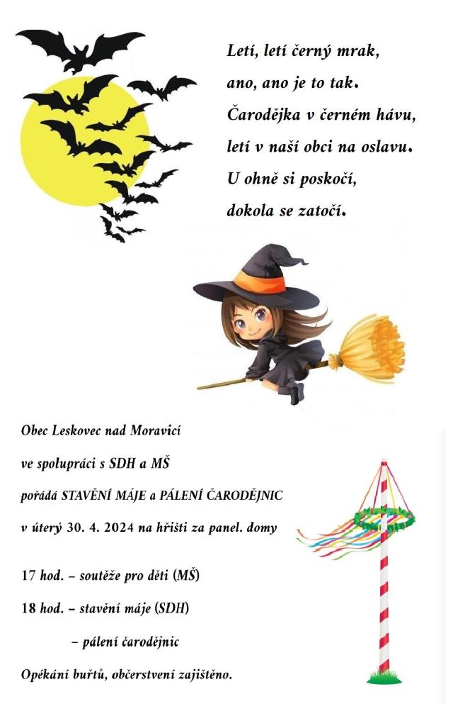 Obec Leskovec nad Moravicí ve spolupráci s SDH a MŠ pořádá STAVĚNÍ MÁJE a PÁLENÍ ČARODĚJNIC