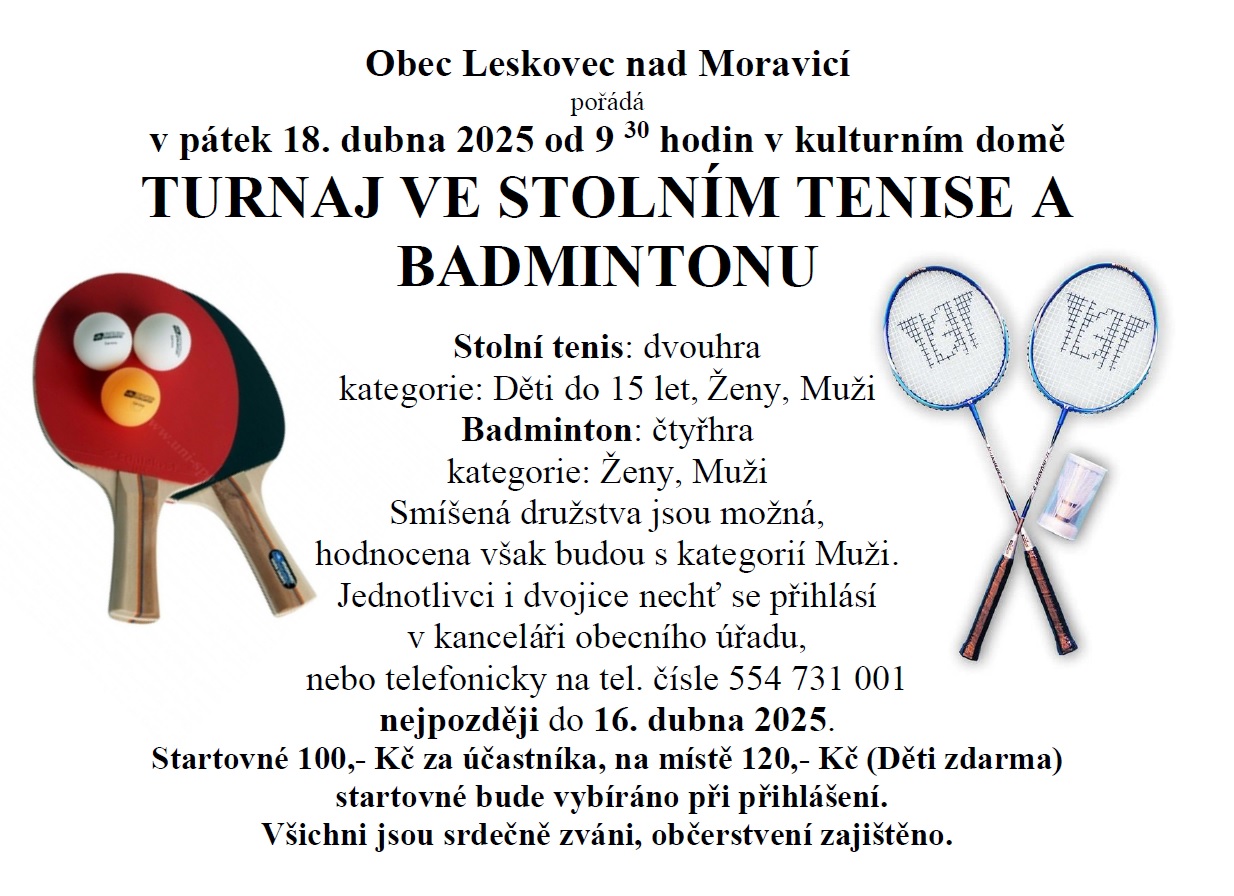 Obec Leskovec nad Moravicí pořádá v pátek 18. dubna 2025 v kulturním domě turnaj ve stolním tenise a badmintonu. K dispozici budou kategorie pro děti, ženy a muže. Přihlášení do 16. dubna 2025, startovné 100 Kč za účastníka, na místě 120 Kč, děti zdarma.