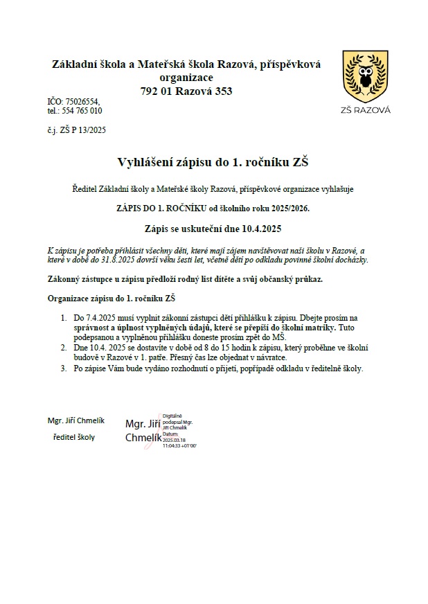 Základní škola a Mateřská škola Razová vyhlašuje zápis do 1. ročníku pro školní rok 2025/2026. Zápis se uskuteční 10. dubna 2025, přihlásit se mohou děti, které do 31. srpna 2025 dovrší věku šesti let. Zákonní zástupci musí donést rodný list dítěte a svůj občanský průkaz.