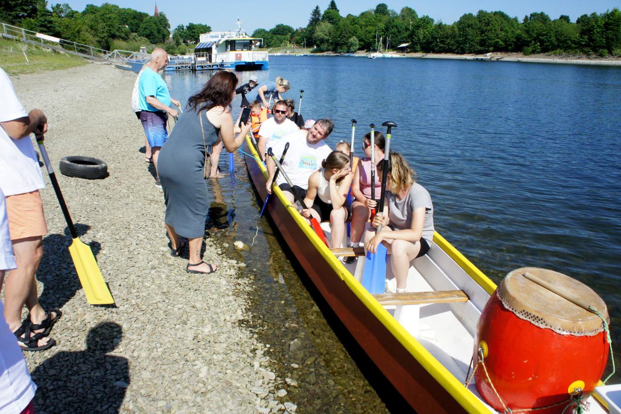 Trénink "DOMÁCÍCH" a vyzkoušení si pádlování na dračích lodích se uskutečnil v sobotu 14. června na pláži.